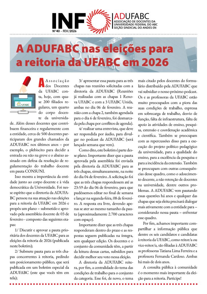 Boletim INFO ADUFABC Nº40 Fevereiro 2026 – Eleições Reitoria UFABC